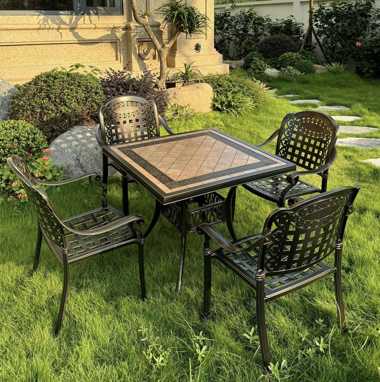 Điểm nhấn đặc biệt của bộ bàn ghế nằm ở mặt bàn đá gốm với họa tiết caro mắt, tạo nên tổng thể hài hòa và độc đáo. Các ô caro đan xen mang đến hiệu ứng thị giác sinh động, phù hợp với cả phong cách hiện đại tối giản lẫn vintage nhẹ nhàng. Dù đặt ở sân vườn, ban công, hiên nhà hay quán cà phê nhỏ, sản phẩm luôn nổi bật và thu hút mọi ánh nhìn.