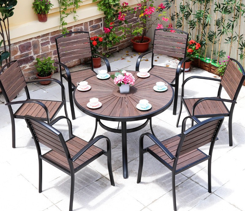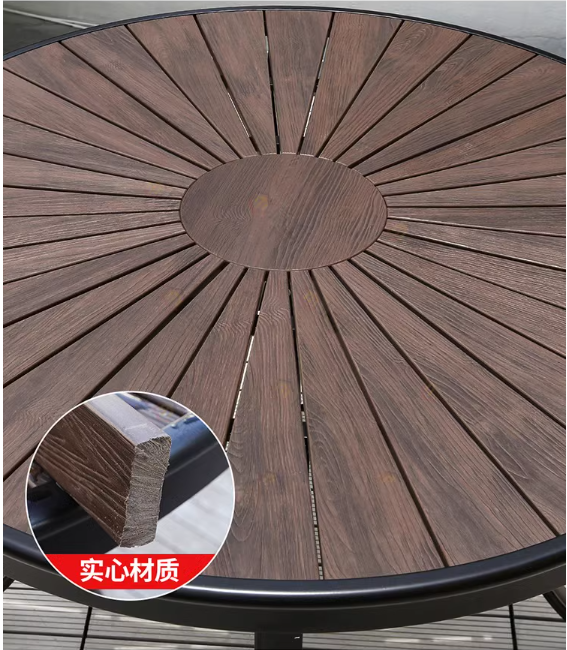 Mặt bàn được làm từ nan gỗ nhựa composite, một loại chất liệu đặc biệt được thiết kế để sử dụng ngoài trời. Composite không bị ảnh hưởng bởi nắng mưa, không lo bị han gỉ hay gãy mục như các chất liệu truyền thống khác. Chất liệu này cũng giúp mặt bàn dễ dàng vệ sinh và bảo trì.