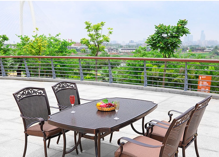 Nhôm đúc: Bàn ghế được làm từ nhôm đúc nguyên khối, mang lại độ bền và chắc chắn vượt trội. Chất liệu này chịu được tác động của thời tiết và không bị ăn mòn hay gỉ sét.