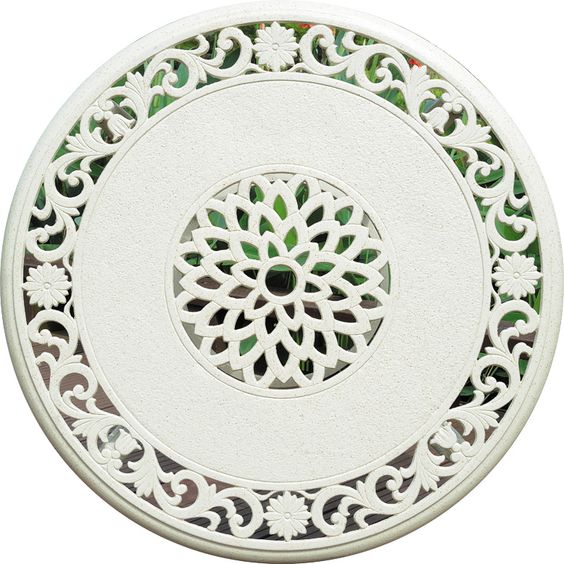 Chi tiết hoa văn hiện đại: Các họa tiết hoa văn trên bàn ghế được thiết kế theo phong cách hiện đại, kết hợp hài hòa với màu trắng sứ để tạo nên một sản phẩm đẹp mắt và thanh lịch.
