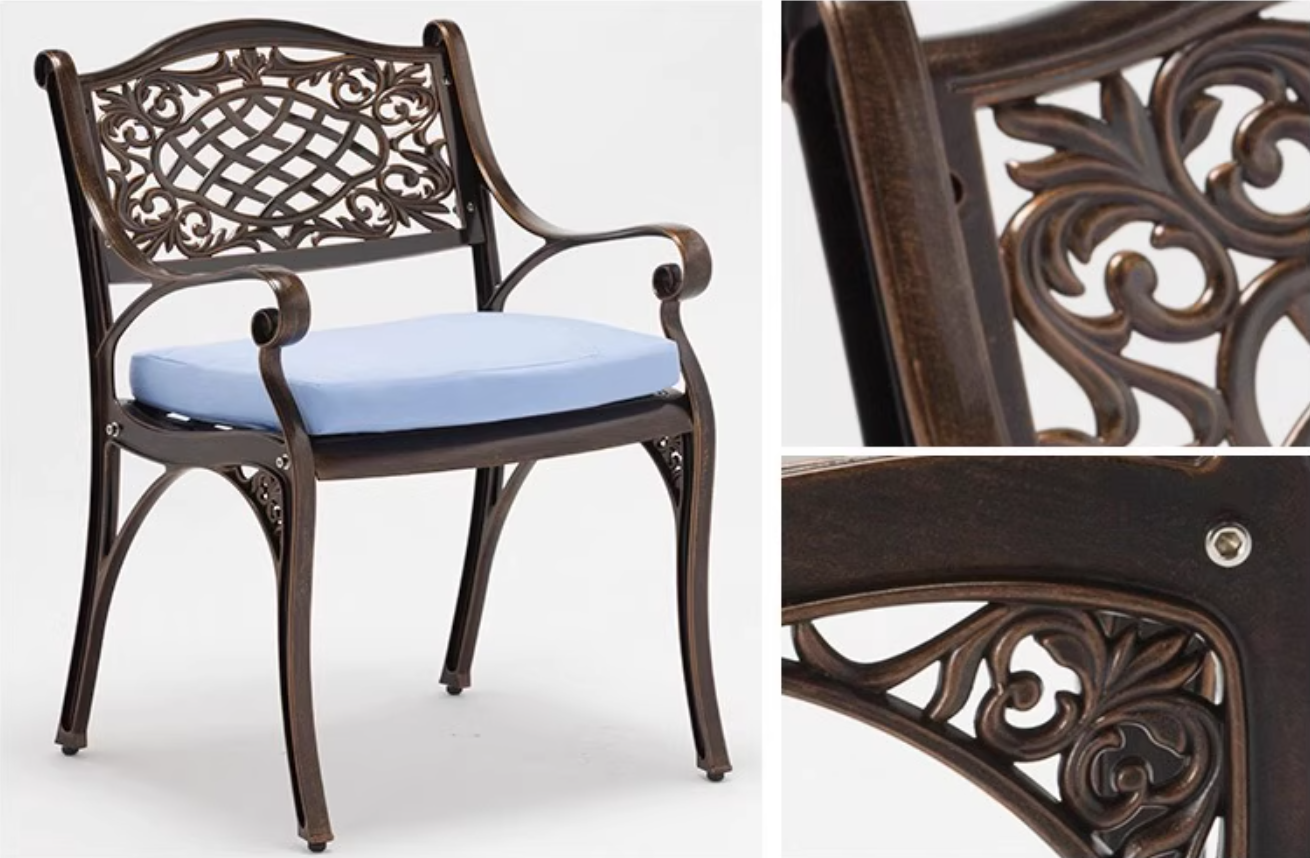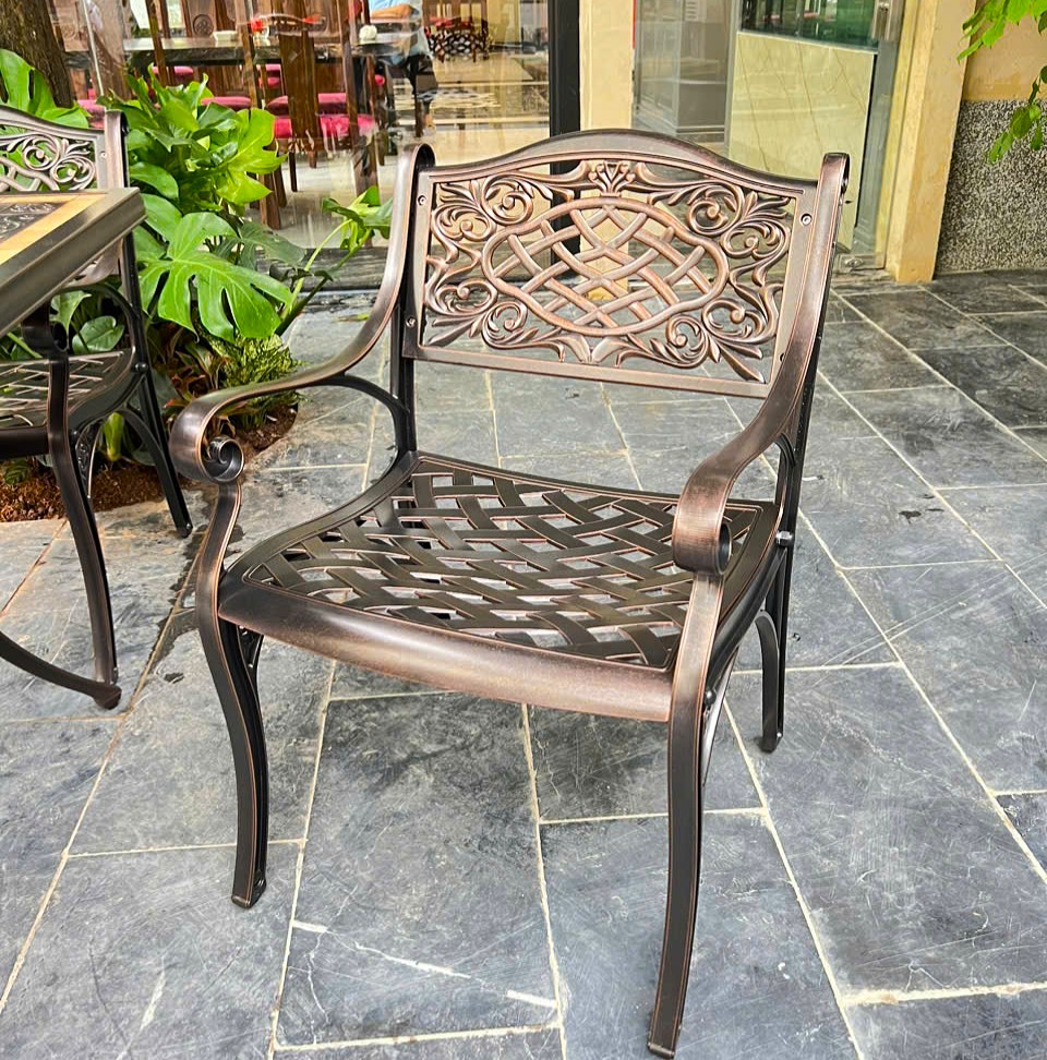 Khung ghế được làm hoàn toàn từ nhôm đúc phủ lớp sơn tĩnh điện cao cấp. Đây là yếu tố then chốt đảm bảo cho ghế có khả năng chống oxy hóa, không bong tróc, không hoen gỉ khi tiếp xúc lâu dài với môi trường ngoài trời. Dù sử dụng ở vùng biển có độ ẩm cao hay những khu vực nhiều mưa, sản phẩm vẫn giữ được độ bền vượt trội.