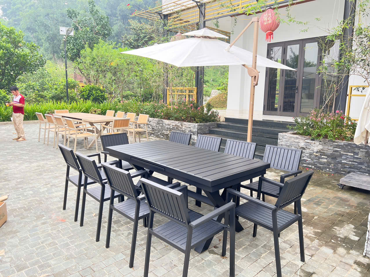 Bộ bàn ghế sân vườn ngoài trời này được thiết kế theo hình chữ nhật thông minh thu gọn và kéo dài có kích thước dài dành cho 8-10 ghế ngồi là 180/240*90*73cm và ghế ngồi có kích thước là 55*54*88cm có tay vịn nên người ngồi cảm thấy rất thoải mái. Toàn bộ khung bàn và ghế được sử dụng chất liệu hợp kim nhôm kết hợp vời lớp sơn tĩnh điện giúp cho sản phẩm bèn và tốt hơn, mặt bàn và ghế được làm từ nan gỗ nhựa composit chống thấm nước một loại vật liệu được sử dụng phổ biến nhất hiện nay trong ngành ngoại thất.
