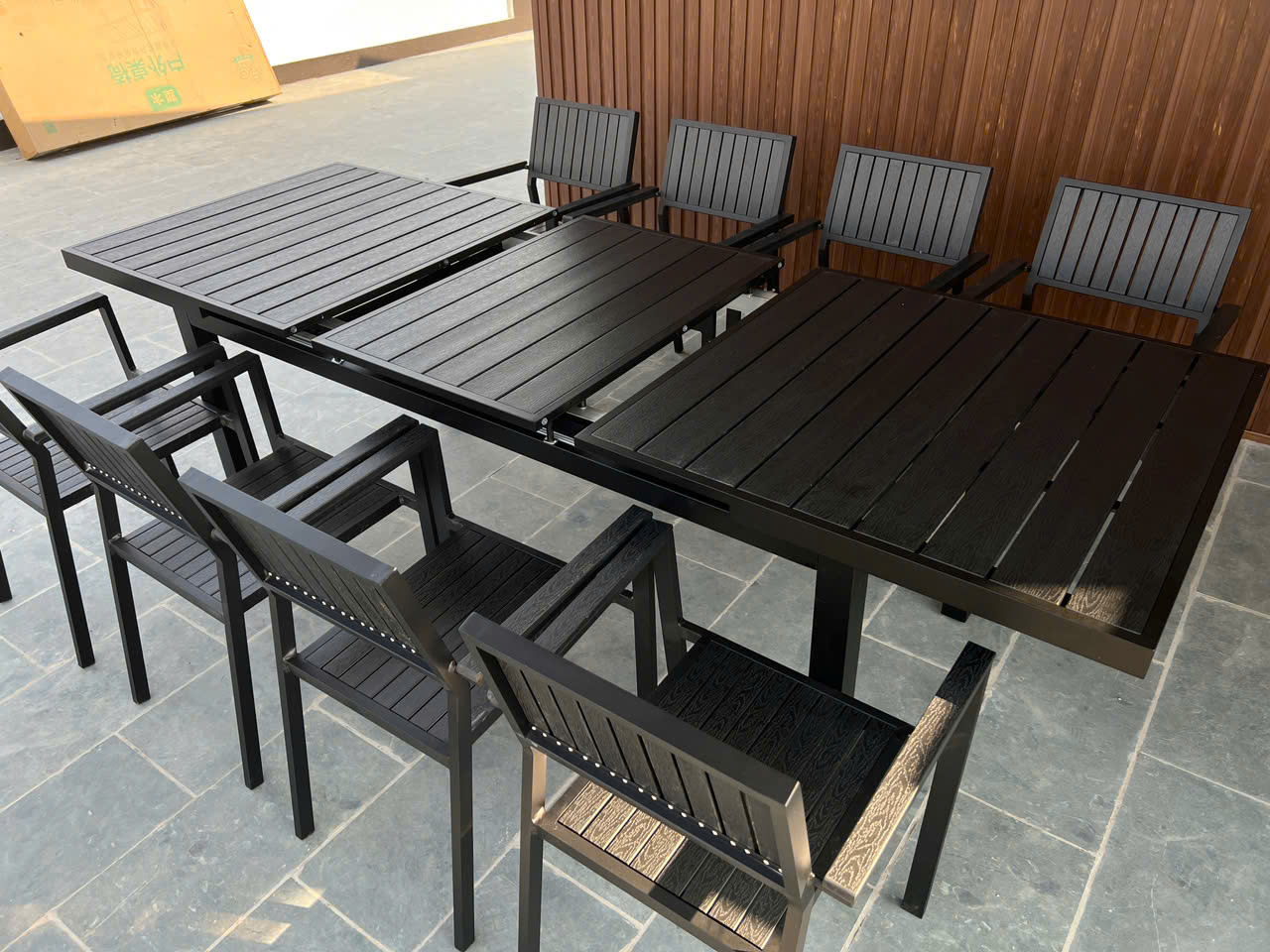 Bàn ghế sân vườn ngoài trời composit D180/240 màu đen, khung bàn được làm từ vật liệu nhôm đúc sơn tĩnh điện và nan gỗ nhựa composit, với chất liệu này nó được sử dụng phổ biến nhiều nhất trong ngành sản xuất nội ngoại thất bởi tính năng của nó có độ bền cao và chịu đươc nhiều điều kiện thời tiết nắng mưa thất thường của Việt Nam. Sản phẩm này sẽ là sự lựa chọn tuyệt vời cho những ai muốn phong cách khác biệt.