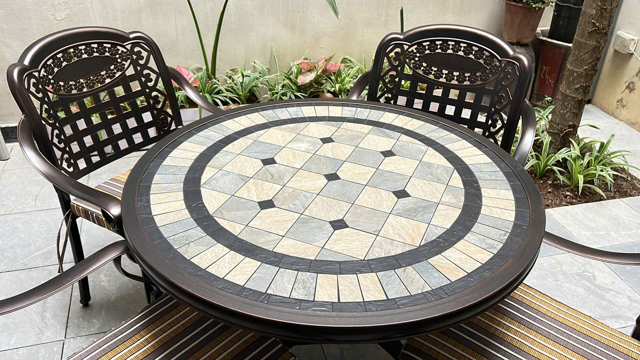 Bộ bàn ngoài trời được làm bằng chất liệu nhôm đúc mặt gốm, khung bàn và ghế được phủ thêm hai lớp sơn tĩnh điện cao cấp. Chất liệu này không chỉ cứng cáp mà còn có khả năng kháng nước, kháng gỉ và hạn chế tối đa các tác động từ môi trường. Bạn có thể đặt bộ bàn ghế nhôm đúc nghệ thuật làm bàn ăn/bàn trà tại khu vực sân vườn/ban công mà không phải lo sợ thời tiết bào mòn.
