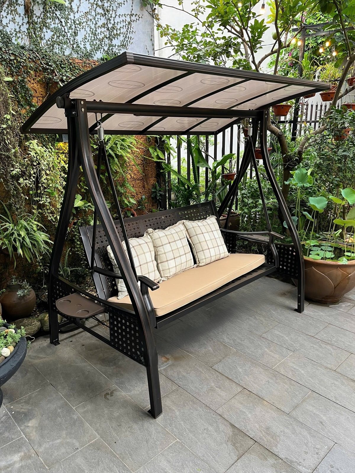 Thiết kế 3 chỗ ngồi rộng rãi giúp xích đu đáp ứng nhu cầu sử dụng cho cả gia đình. Từ ông bà, bố mẹ đến các bé nhỏ đều có thể cùng nhau ngồi thư giãn, trò chuyện hoặc tận hưởng không khí trong lành của sân vườn. Đây cũng là lý do khiến nhiều gia đình lựa chọn xích đu nhôm đúc như một món “nội thất ngoài trời” không thể thiếu.