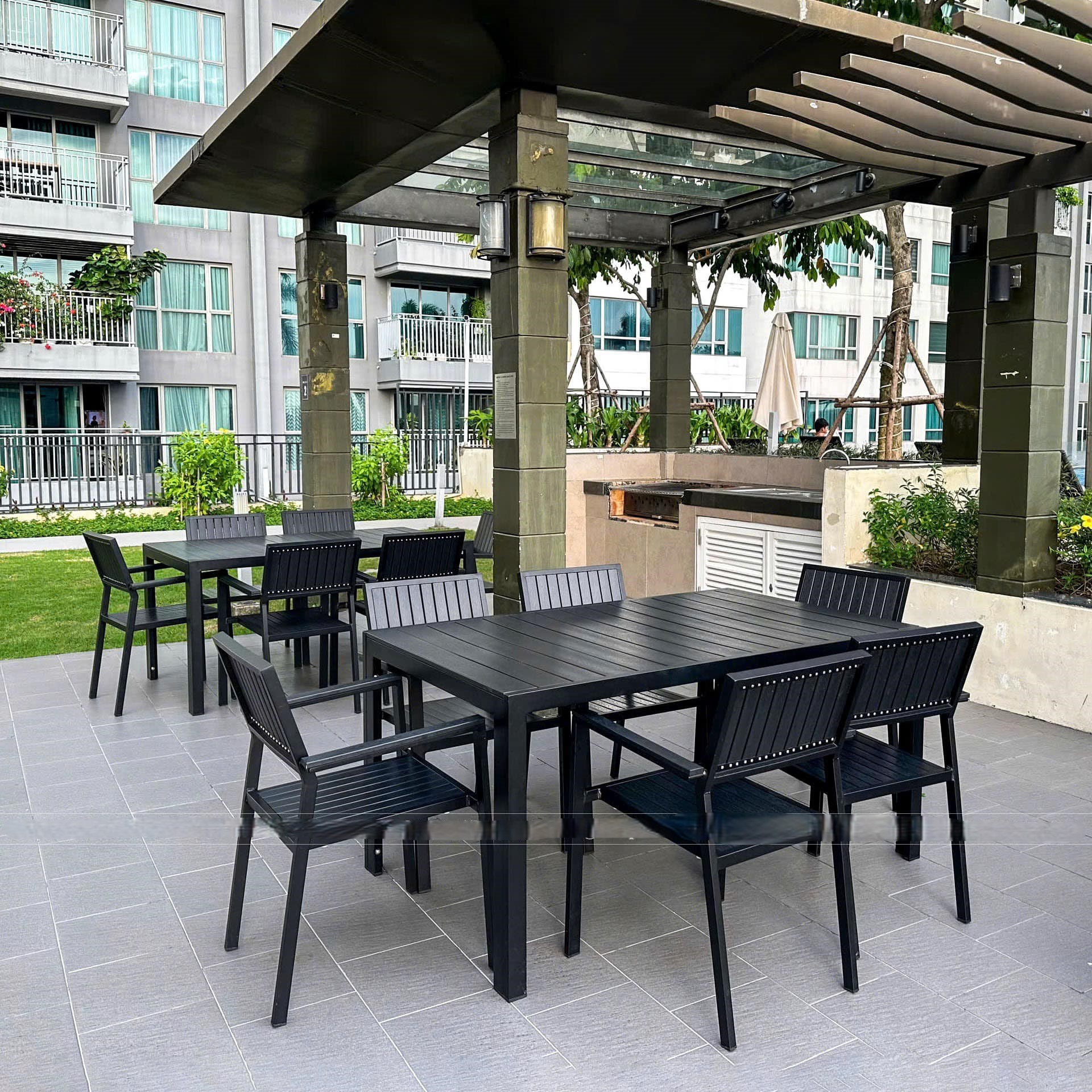 - - Khu vực thư giãn: Bố trí bàn ghế dưới các cây xanh, gần hồ bơi hoặc nơi có bóng mát.