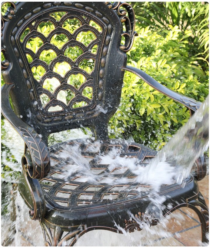Bàn ghế nhôm đúc không thấm nước, không bám bụi nhiều, dễ dàng làm sạch bằng khăn ẩm hoặc xịt nước trực tiếp mà không lo hư hại như bàn ghế gỗ hay sắt, thép...