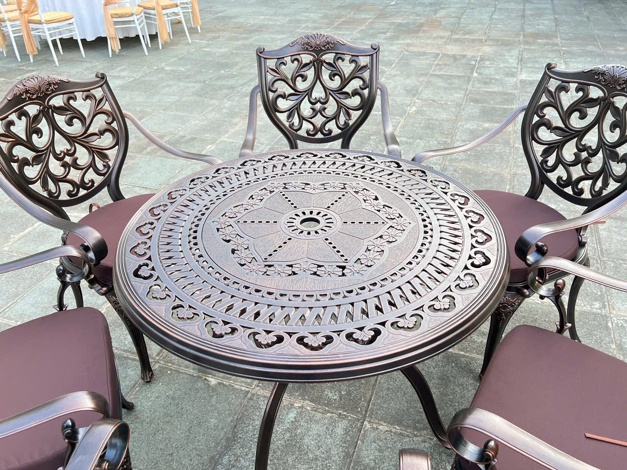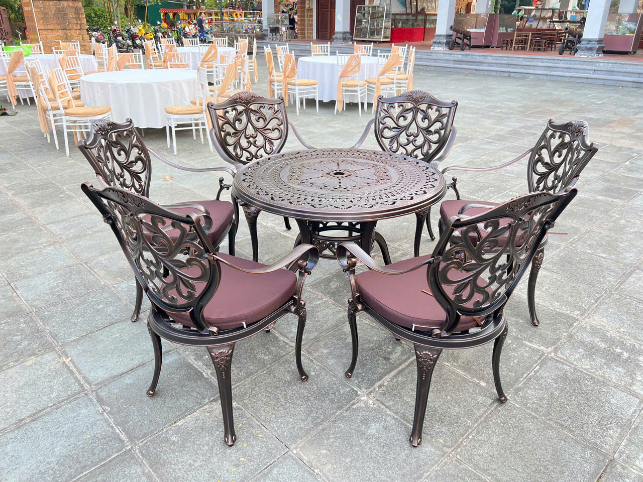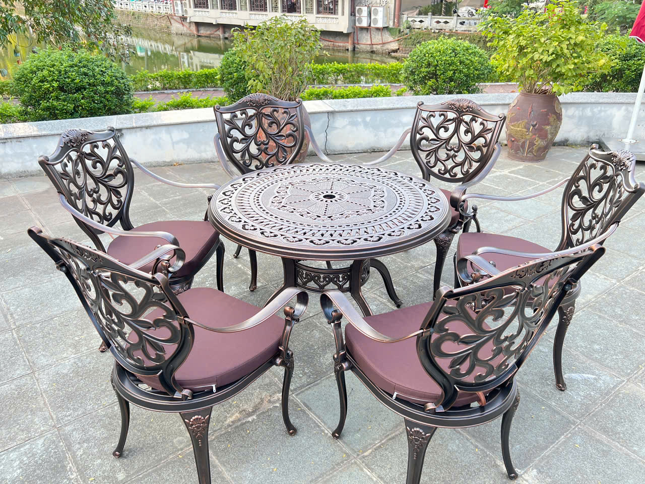 NỘI THẤT BÌNH AN GIAO THÀNH CÔNG BỘ BÀN GHẾ NHÔM ĐÚC NGOÀI TRỜI D100 - 6 GHẾ LÁ PHONG CÁCH TÂN CỔ ĐIỂN CHO KHÁCH HÀNG TẠI SƠN TÂY
