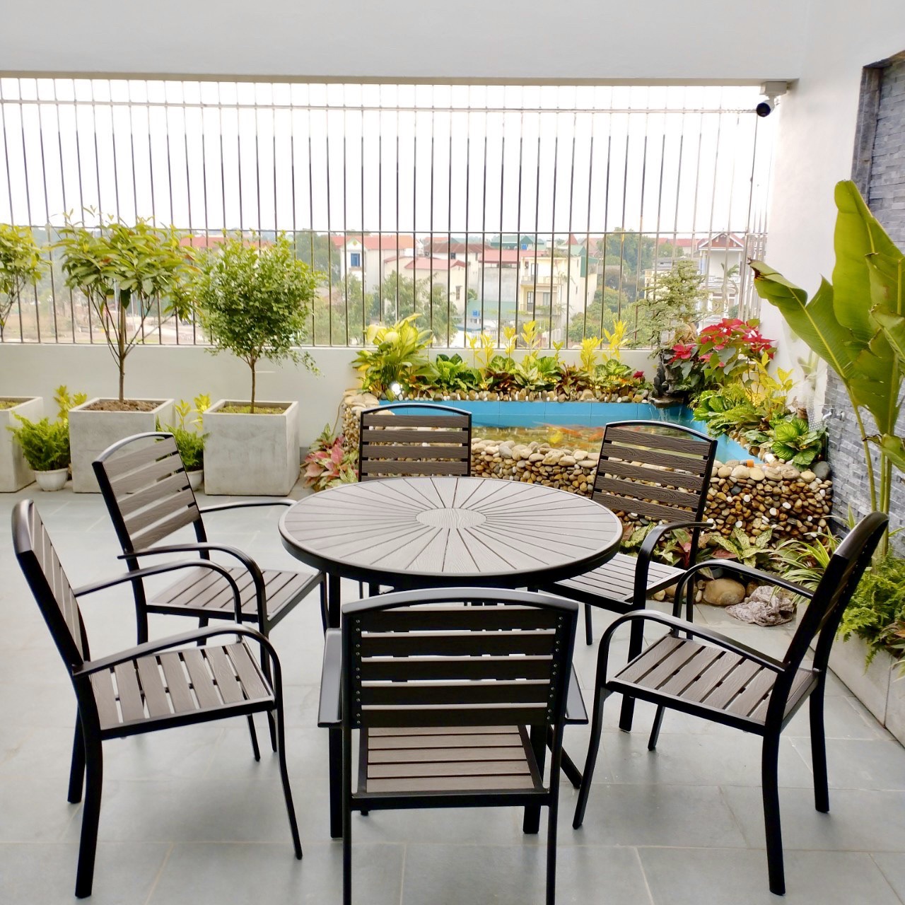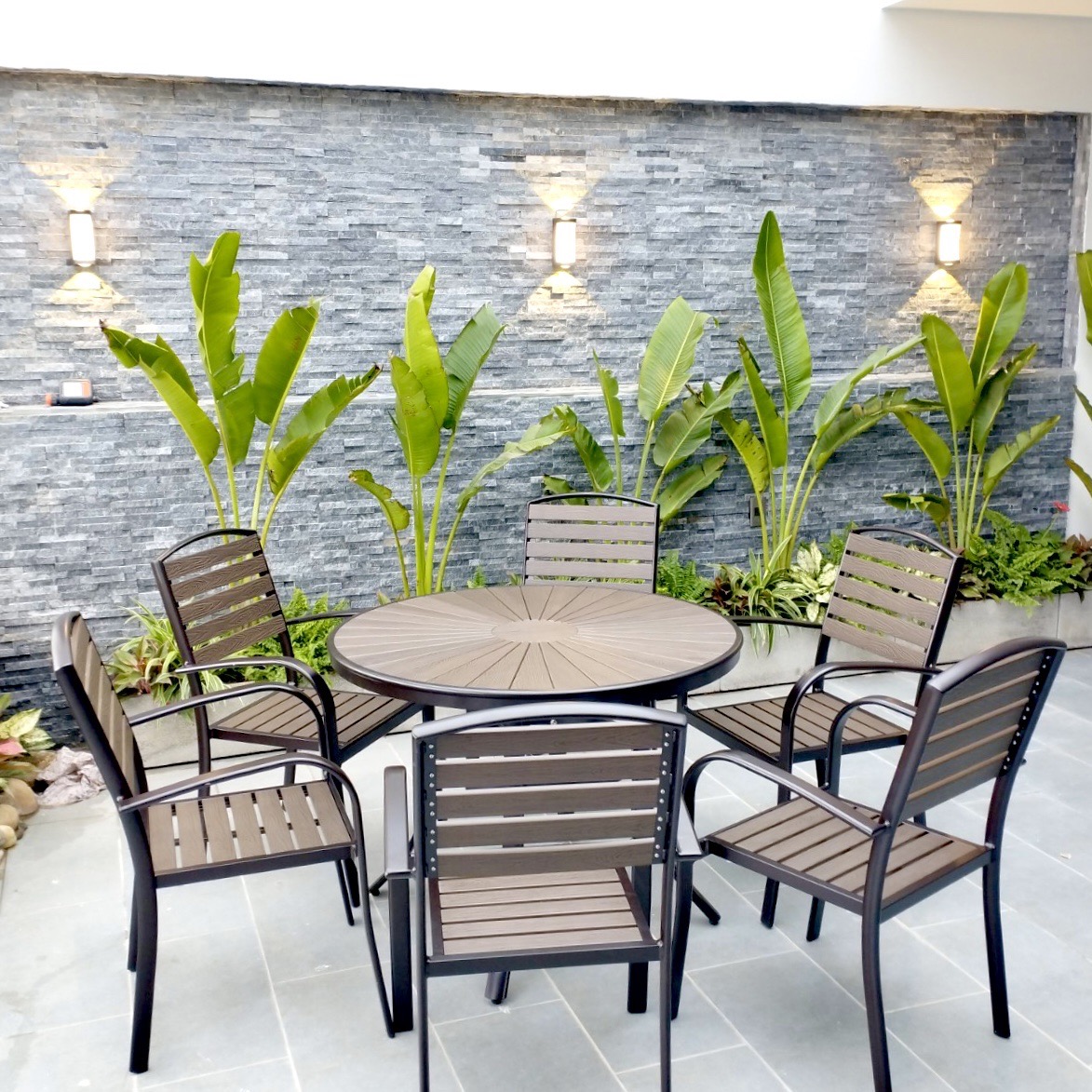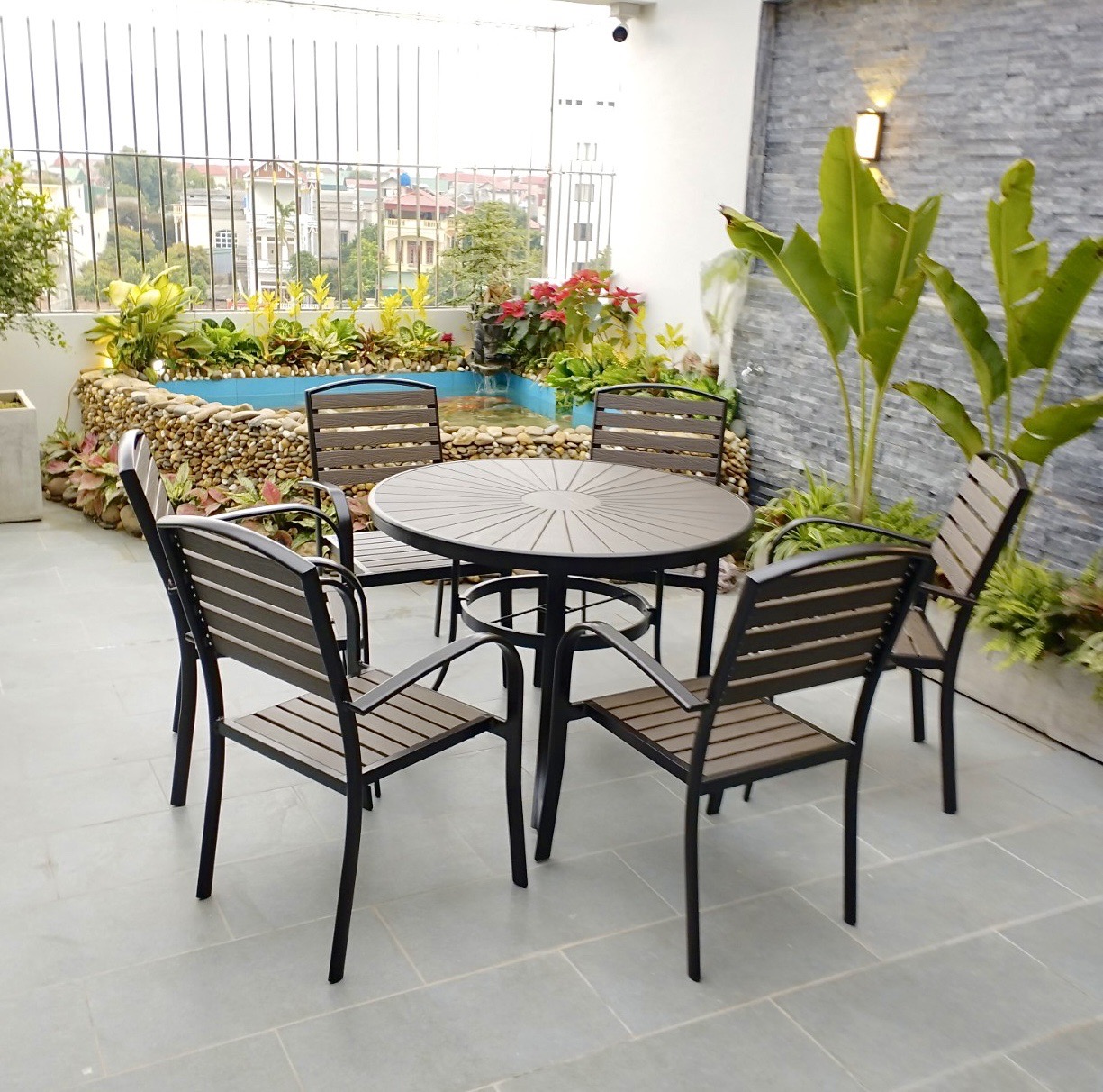 Với chất liệu khung nhôm đúc cao cấp phối cùng nan nhựa Composit có độ bền cao, bạn có thể đặt bộ bàn ghế ở bất kì không gian ngoài trời nào như sân thượng, sân vườn, phòng khách hay phòng bếp đều rất đẹp và sang trọng. Bộ sản phẩm chắc chắn sẽ là điểm nhấn nổi bật cho không gian của bạn