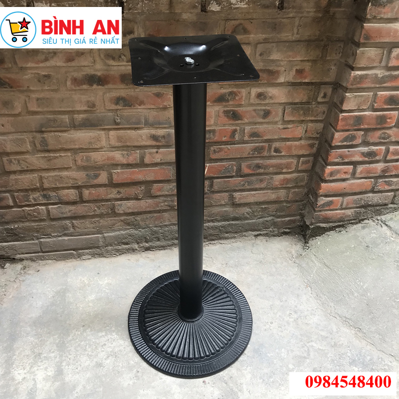 Chân bàn café đúc đế tròn 45cm cao 980cm được sơn màu đen với họa tiết bên dưới là điểm nhấn của chiếc bàn. Phần đé bên dưới bằng gang đúc nguyên khối làm tăng độ vững chắc cho chiếc bàn, phần bên trên là mặt bích hình vuông có sẵn lỗ để khoan bắt vít vào mặt bàn.